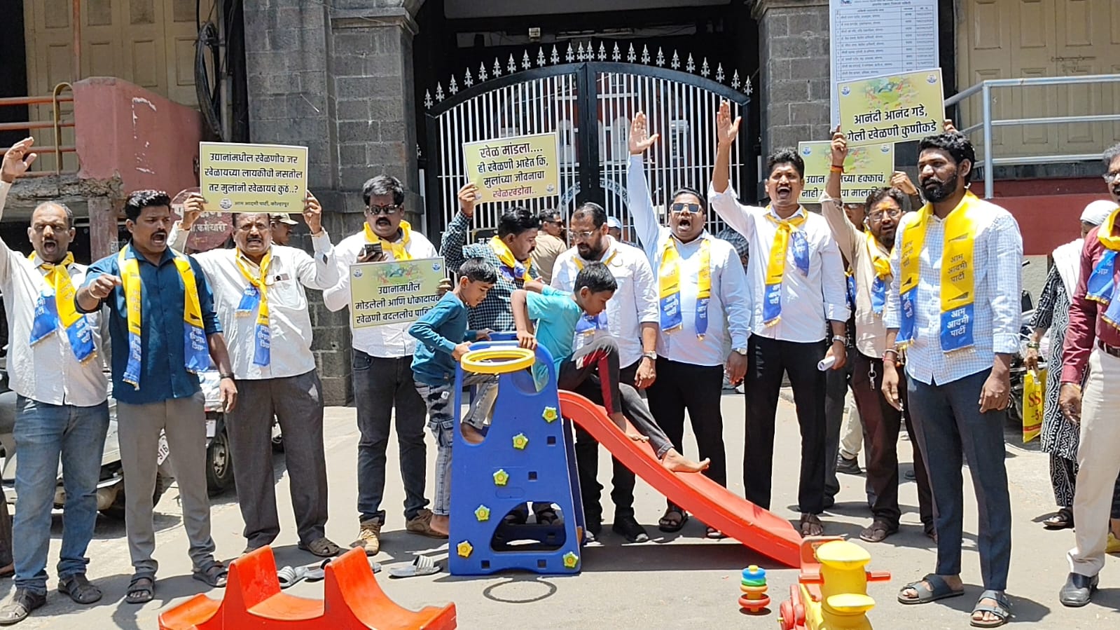 आंदोलनस्थळी घसरगुंडीवर खेळत लहान मुलांनी महापालिकेच्या कारभाराचे विडंबन समोर आणले.