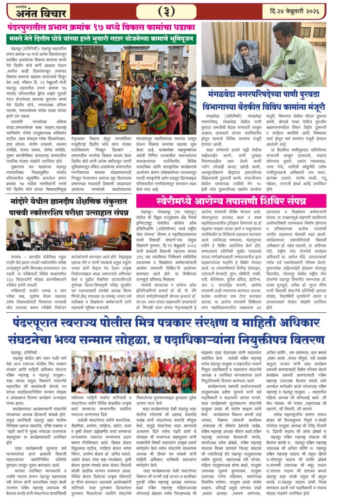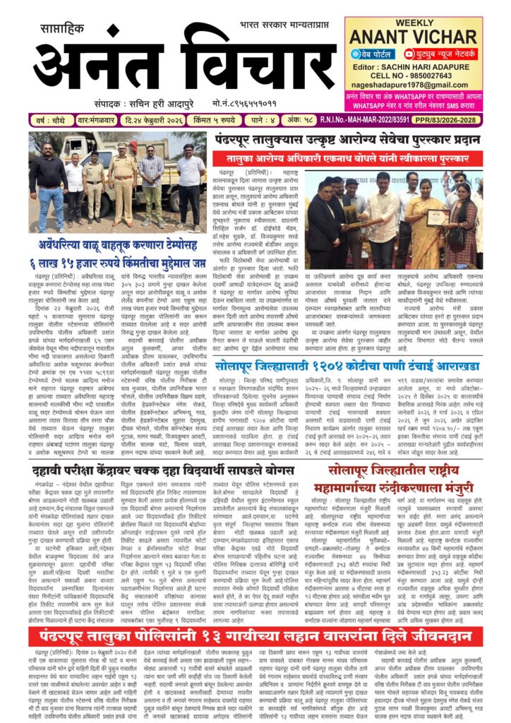 आपला परीसर साप्ताहिक अनंत विचार 24/2/26 अंक संपादक : नागेश आदापुरे February 25, 2026 0 Post Views: 2 About the Author संपादक : नागेश आदापुरे Author Visit Website View All Posts Post navigation Previous: भीमा नदीपात्रातून अवैध वाळू वाहतूक; पंढरपूर तालुका पोलिसांची कारवाई, 6.15 लाखांचा मुद्देमाल जप्त Leave a Reply Cancel replyYour email address will not be published. Required fields are marked *Comment * Name * Email * Website Save my name, email, and website in this browser for the next time I comment. Related Stories आपला परीसर संपादकीय : “पक्ष नव्हे, काम बघा; नेते नव्हे, माणूस बघा संपादक : नागेश आदापुरे November 9, 2025 0 आपला परीसर भोसे मध्ये शालेय पोषण आहाराचे धान्य पुरल्याची पालकाची तक्रार जिल्हाशिक्षणाधिकारी यांची पाहणी संपादक : नागेश आदापुरे October 6, 2025 0 आपला परीसर लहुजी वस्ताद चौक ते (बायपास) गोपाळपूर रोड मंगळवेढा आणि संतपेठ शाळा नं 7 परिसरातील रस्ते व ड्रेनेज दुरुस्ती करण्याची मागणी :- सामाजिक कार्यकर्ते दिपक नाईकनवरे संपादक : नागेश आदापुरे September 28, 2025 0